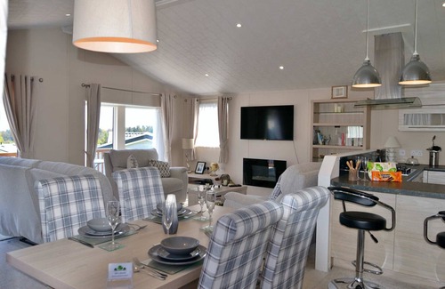 Large luxurious interior with large comfy sofa's, fully stocked kitchen with everything you need for a home away from home holiday. Sleeps five in two bedrooms, one with bunk beds, double on the bottom. Main bedroom has shower onsuite and the main bathroom has shower over bath.