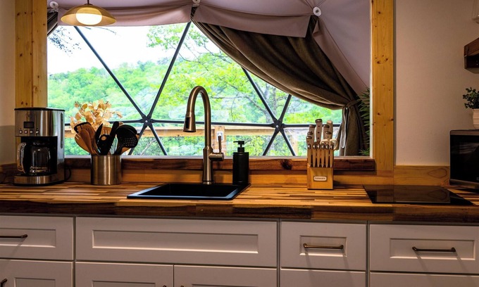 1 Queen Sized Sofa Bed, 1 King Sized Bed in the Loft, 1 Full Sized Refrigerator, Sleeps 4 and has its own incredible view. Our geodesic domes are equipped with kitchens, bathrooms, hot tubs, cozy beds.