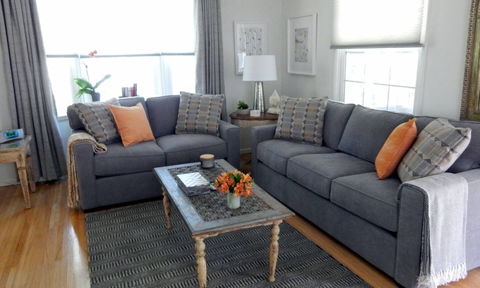 The apartment has a four poster queen size bed in the bedroom with a full just remodeled bath attached, (tub and shower), a large living room with a queen sleeper sofa for additional guests if needed, a dining room and a fully equipped kitchen. There is also a wide covered porch surrounded by trees off the living room with a love seat, table and chairs and is a great place to relax out doors and watch the humming birds at the feeder. The kitchen door leads down to a private fenced and landscaped yard with patio furniture, shaded by a majestic elm tree..