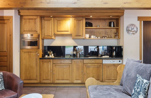 The apartment sleeps 5 people, and has been carefully equipped with everything guests might need during their stay. Tucked under the wooden eaves, the living room has double French windows opening onto a balcony with wonderful mountain views. There is a table and chairs on the balcony, ideal for al fresco dining. In the main living area, there are stylish leather armchairs, a sofa, a coffee table and a flat-screen TV. The dining area has a table for 6 people. The kitchen is equipped with an induction hob, oven, microwave, dishwasher, fridge/freezer, Nespresso and coffee machines.