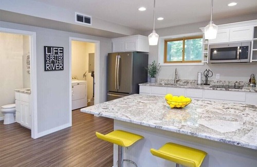 Indulge in comfort with five bedrooms catering to all ages, featuring cozy family suites with toddler beds and serene spaces offering riverfront views. Enjoy the convenience of two kitchens (upstairs and downstairs), smart TVs, a washer/dryer, outdoor boathouse, canoe, kayak, and many more amenities!