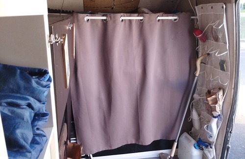 Guest accommodations at Van set up in a PUBLIC parking lot that's good for repairs feature separate bedrooms.