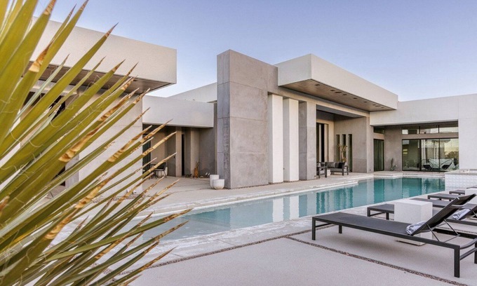 The standout feature of this modern architectural gem is its exquisite infinity pool, which flows seamlessly into the stunning desert landscape. As you enter, you'll be greeted by tall ceilings and an open floor plan designed for entertaining. Enjoy the outdoor dining areas, fire pit, and luxurious amenities like a fully stocked game room and a hot tub. Each of the five bedrooms features ensuite bathrooms and private patios, ensuring comfort and privacy for you and your guests. Additional offerings include high-end appliances, Sonos sound system, ample parking, and professional cleaning services, all curated to make your wedding experience extraordinary.