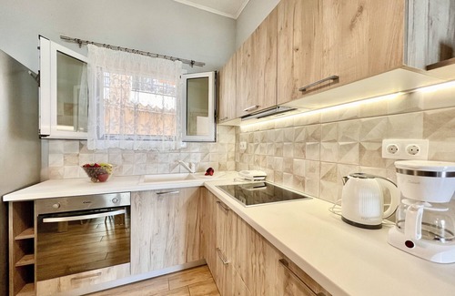 Vasilis Home, modern and stylish, is among the best located and probably one of the most welcoming properties in the sought after area of Nissaki in the North-East coast of Corfu. Vasilis Home is perfectly located just 100m from the beach with its crystal clear water, a couple of steps from excellent waterfront tavernas, supermarket, bus stop . It is definitely the perfect holiday home for all those guests looking after a high quality holiday in a unique location virtually on the waterfront without the need to rely constantly on a car. Sleeping 4 guests in 2 bedrooms (with the possibility of an extra guest in the large lounge), Vasilis Home is fully air-conditioned (included in the rental price) and set to impress for its high value for money, style and breathtaking views to the sea. For the convenience of our guests, next to the property, there is also an independently run swimming pool complex with bar and restaurant which is open to the public (opening dates - usually end of may until beginning of october - and entrance requirements may vary).