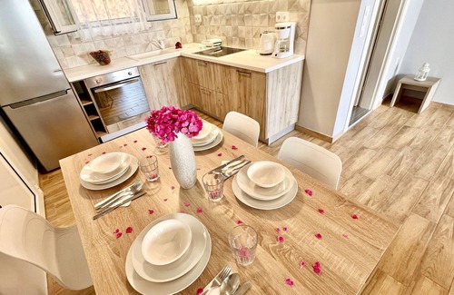 Vasilis Home is set over one floor and is semi-detached to enjoy amazing views and most of the privacy. The property has been totally renovated to the highest standard. Entrance via the large private patio (furnished and providing sensational views) is onto the spacious and airy open plan lounge with adjoining kitchen. There is a comfortable L-shaped sofa (satellite TV, wi-fi internet), fully equipped kitchen, dining area. There are 2 spacious air-conditioned bedrooms, one double with sea-views (as well as balcony doors leading to the panoramic terrace) and one twin, sharing a family shower room with hydromassage shower.