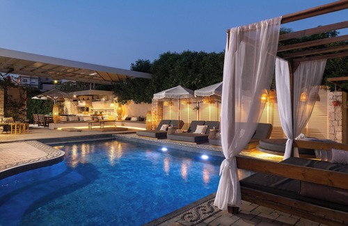 Vento Imperiale Estate is a 5-bedroom villa styled and decorated by a brilliant interior designer. All spacious bedrooms are carefully decorated in a sophisticated contemporary style mixed with classic details. Also, there are 2 double sofa beds in the living areas. Guests will find two fully equipped kitchens, suitable for any meal preparation along with comfortable seating areas. There are five dreamy bathrooms, two of them are ensuite. One of the bathrooms has a bathtub for your ultimate relaxation and the rest have stylish showers. Also, there is a wc. In addition, there are plenty of living areas in unique colors. There’s free Wi-Fi access throughout the property as well as flat screen TVs. Vento Imperiale Estate continues to surprise you as you walk to the outdoor facilities. Outdoors, you will find the enchanting private swimming pool and its unique sunbeds and dining area. Also, there is a billiard and a table football for fun moments. Guests will find the BBQ facility and the seating area to relax and enjoy a family or friends gathering. There’s free everyday cleaning service available.