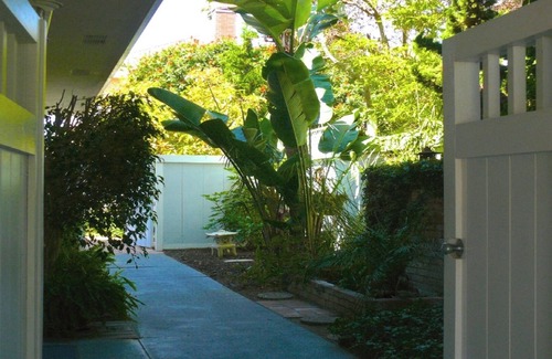 Park off street in the private carport on site. Upstairs are both bedrooms and the full bath. Downstairs is a fully stocked kitchen, seated dining area and living room -- which open into a lush private garden. The lanai is wonderful to lounge on, have dinner on the outdoor table. Enjoy sitting outside, taking in the organic fig, avocado and citrus trees. Nearby are a Von's grocery store, a Starbuck's and laundromat. Everything you need is here!