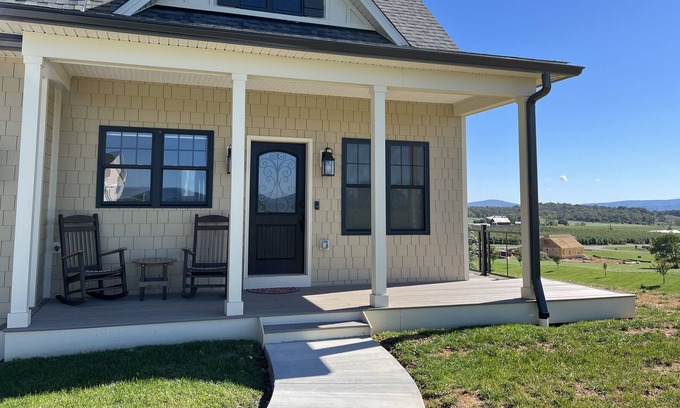 Ideal for a couple, this is an independent guesthouse adjacent to the main house on a 4-acre lot, all completed in 2021. The guesthouse has a full kitchen and gas fireplace, and comes with access to an independent gym on the premises. With mountain and valley views all-round, the front porch offers breathtaking sunset views while the back porch features a hot tub with 270 degree vistas of orchards, mountains and neighboring trees. Two wineries, a farmer's market, Martin's supermarket, several great restaurants as well as Old Town Winchester all just 5-15 minutes away, with Front Royal and Shenandoah River a mere 25 minutes' drive. Great biking and hiking routes and views of orchards, mountains and more all around the property, which is part of the newly developed Mountain Vista Estates off Hites Road.