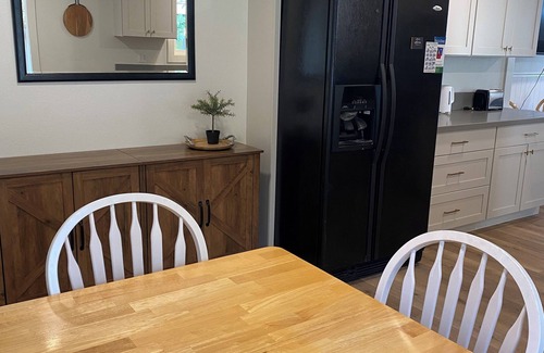 Stay comfortably in Keizer at this 3-bedroom house. The bedrooms feature 1 king bed and 2 queen beds, perfect for a serene night's sleep. With amenities like WiFi, a washing machine, and heating, guests will feel right at home. The 2 bathrooms offer a hair dryer, shower, and bathtub for added convenience. It's easy to see why you'll be able to unwind at our place. Relax with the whole family at this peaceful Keizer home. The house is very spacious. It has a living room, a huge kitchen and then another family room. Each one of the bedrooms are large and both of the bathrooms are newly appointed. We love this home because it's perfect for families and longer-term stays. It was our home and now we look forward to sharing it with your family. The kitchen is new with all of the cabinets and counters tops. All of the beds are brand new. Internet is high speed.