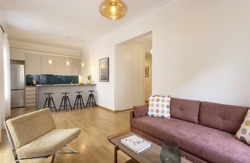 A very chic two bedroom apartment. A minimal haven nestled in the hip Pangrati area. Step inside and experience a space that effortlessly combines the ambience of another era with modern comfort. This place features wooden floors that exude warmth, setting the stage for a cozy and inviting atmosphere. Accents of vibrant colors throughout the space add a playful touch. The stylish open-plan kitchen and dining area are perfect for entertaining or working from home. The carefully curated furniture and decor pieces reflect a contemporary aesthetic while paying homage to timeless charm. With two bedrooms, this apartment offers a peaceful retreat for a restful night's sleep. Every inch of the space has been recently refurbished, ensuring a fresh and modern experience for our guests. Embrace the vibrant energy of the Pangrati area, known for its trendy cafes, cultural hotspots, and eclectic shops. After a day of out and about, return to the comfort and the soothing ambience of this place. Unwind, relax, and soak in the unique atmosphere. Whether you're visiting for business or leisure, our apartment provides a perfect blend of contemporary style and classic allure.IF YOU WISH TO USE THE SOFA BED, PLEASE MAKE YOUR RESERVATION FOR 5 GUESTS!Please note that there is a charge of €15 payable in cash upon arrival for late check in between 21:00 pm-21:00 pm.