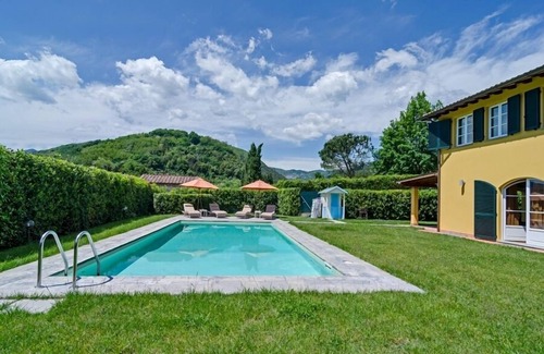 Located in the North-West countryside of Lucca, between the town and the Versilian coast, The villa is a welcoming and secluded property, rich in colors, harmony and comforts. We are conveniently located close to the famous beach resorts of Versilia and the magic town of Lucca. Since it is less than 12 km from the motorway exit, it is an ideal base for visiting the main Tuscan towns. Guests who rented our villa in the past have particularly appreciated the beauty and quiet of the estate. The Villa has been built with modern materials and furnished, and is especially bright and full of light. Its structure makes it ideal for two families ( two separate kitchens ) who wish to take a holiday together, while maintaining their own privacy.Modern facilities, including a TV sat and WIFI connection,hydro massage have also been provided. Shops and restaurants are located at only 500 metres from the villa. .In front of the house there is a lovely large covered patio furnished as an outside sitting area, with table and chairs, which is ideal for eating outside. The big pool (10 metres x 5 h.1,2 / 1,5) is just in front of the terrace, in a level garden that is well suited for young families. The pool system uses no chlorine but salt, so the water is healthy and perfect for children or those who are allergic. Quality beach towels are provided for each guest. Nice outdoor garden area for children: two nice swings and a sandypit.The area around the villa is ideal for people who love cycling and relax.