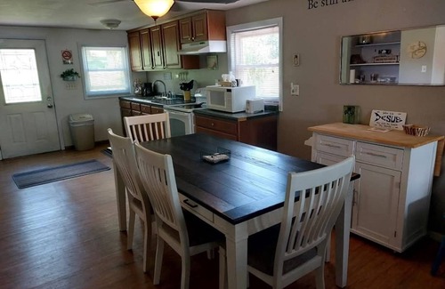 Enjoy this clean, adorable, lakefront home. Just walk out the back door to experience the crystal clear, 250 acre Lake. The long Pier can be used for all your boat-docking needs, or spend the day fishing on the extended fish platform. The gradually-sloping sandy beach is great for all ages to swim, snorkel or just lay in the sun. All You need is already their-Beach Chairs,Grill, Picnic bench even a paddle boat and row boat are provided.