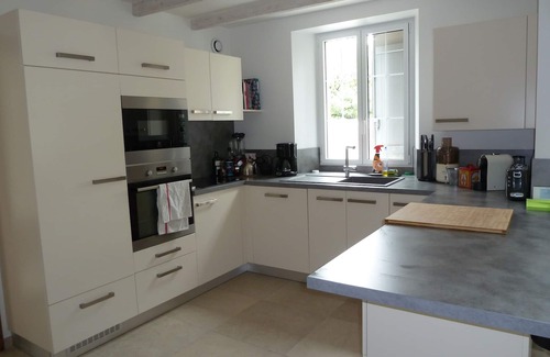 On the ground floor, large living room: living room with stove, dining room and open kitchen; Large entrance with dressing; Separate toilet; Laundry (sink, washer dryer, freezer); Two bedrooms, one with a bed 160, the other with a bed in 140; Bathroom. The kitchen is fully equipped (oven, microwave, dishwasher, small appliances: robot, blender, toaster, Nespresso coffee machine, filter coffee maker ...)