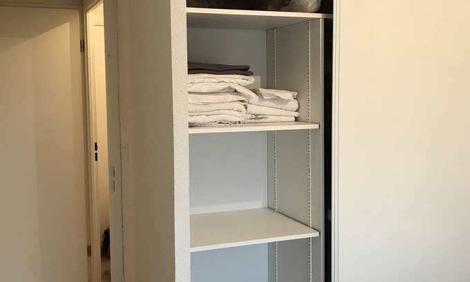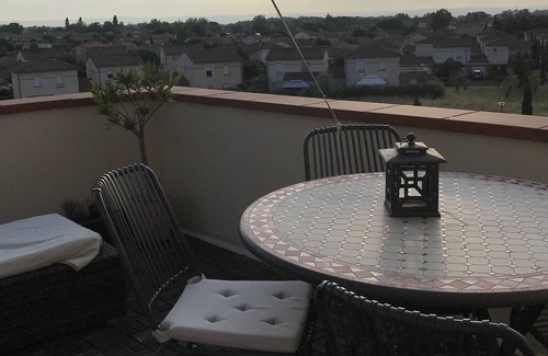 Very nice apartment on the top floor with terrace, view of the Pyrenees, very quiet, fitted kitchen opening onto a large living room with open sofa double bed, a master bedroom with TV, wifi if you have a laptop. Outdoor parking. Very cozy. Bathroom, bathtub, swimming pool in the residence.