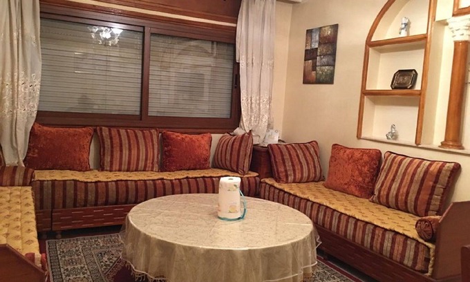 Close to Sour Elmaagazine in the center of Tangier, I offer you a 2 bedroom apartment (one master with a large bed, and one for children with two single beds) plus a large living room, a bathroom, two toilets and a kitchen.