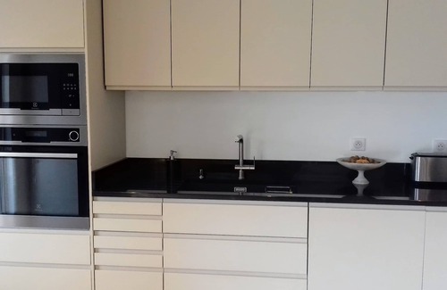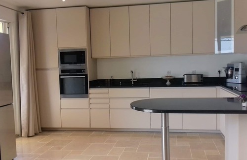 Fully equipped modern kitchen with granite worktop, double oven/microwave column, large butterfly opening refrigerator with freezer compartments, induction cooktop, dishwasher, coffee maker, kettle, toaster,