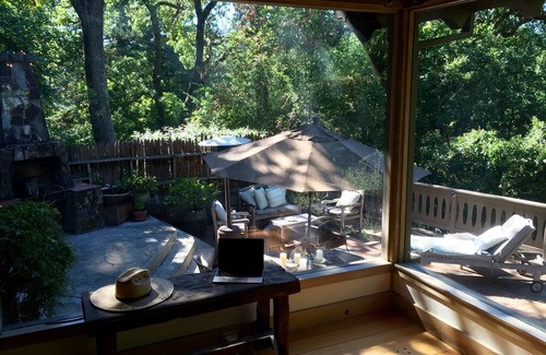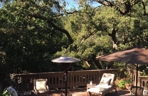 Walls of glass look out to beautiful heritage Oaks, birds, squirrels and the surrounding canyons from the large open and beautiful Great-room. The home has an old world charm with its wrought iron gate, stone walls, gardens and patios you might just feel like you are in the south of France or Italy! Yet this is a modern and well appointed elegant home/ mini estate, it is all yours to enjoy relax and restore. Stroll to town and enjoy all that lively Fairfax offers with it’s many cafes, restaurants, music venues, farmers market, Good Earth or hike the many trails of Mt. Tam and Deer Park right from your door or spend the day at one of it’s many lakes, or near by beaches, this is the good life! Sleep peacefully while listening to the crickets in the large bedroom with its pillow top king size bed, Restoration Hardware furniture and walk-in closet. Soak in the oversize tub in the beautiful garden windowed bathroom. Cooks will love the chef’s kitchen. Winters are gentle here in Marin, rains turn the hills green while most of the country is covered in snow. Guest are warmed by the huge wood burning fireplace, the beauty of Mt Tam is now filled with waterfalls. The magic continues! Discounted for temporary stays of 30 plus days, Enchanted Garden welcomes temporary rentals duration up to 90 days.