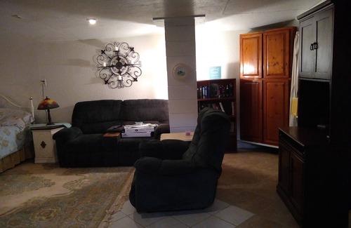 Great for travel nurses or teachers as long term rental. There are dressers as well as a walk in closet attached to the bathroom . Living area consist of a sofa and recliner as well as a big flat screen tv. There is also a full kitchen with a private deck just outside the kitchen door where you have private parking as well. There is a full size washer and dryer located in the bathroom. NO smoking inside apartment and no pets allowed.