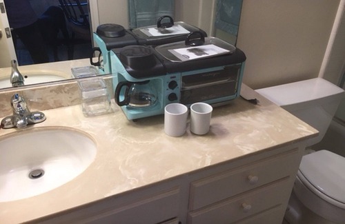 Coffee maker, toaster oven and griddle.