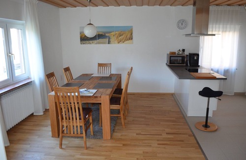 Completely newly renovated and furnished (ground floor) apartment (Feb. 2020). Central location in town and in Upper Franconia. Shops and restaurants within walking distance. Terrace / patio available. Parking spaces in front of the house. Two separate exits / entrances. Bedroom 1: 17 sqm, bed 2x2 meters; Bedroom 2: 17 square meters, bed 2x2 meters; Bedroom 3: 8 square meters, bed 1.6x2 meters; Dining kitchen: 29 sqm, living room: 24 sqm; Flooring: parquet / laminate / tiles; 1 bath incl. WC; 1 further toilet, cable TV, wooden furniture (oiled oak), cot, baby bed, high chair available on request. Bed linen and towels included; Combi microwave, coffee machine (filter coffee), fully automatic coffee machine and kettle incl.