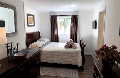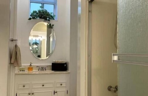 This guest house is connected to the host’s main house and located downstairs with your own separate and private entrance (last renovated August 2024). A large foyer with mini library and day lounger (converts to twin bed) greets you as you first step inside, leading you into the living room with adjoining breakfast nook facing the main windows. The kitchen is full sized with electric four burner stove top oven, a full sized refrigerator, dual sinks, all the kitchen utensils and kitchenware that you'll need, and plenty of counter space. The spacious main bedroom features a large bathroom suite complete with its own powder room. The second bedroom has its own walk-in closet and private lavatory.