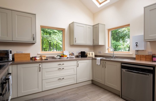 The lounge and dining area is open plan, with a wood burner in the lounge. The kitchen is spacious and light with an upright fridge, five ring induction hob, two fan assisted ovens, dishwasher and a microwave.