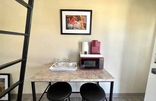 The sleeping arrangements include two FULL size beds, one in the main studio space and one in the loft. If you are booking with 3-4 guests in your party, 1-2 guests will need to be able to climb very tall heights which can be extremely dangerous for small children. Please only book if you are comfortable with this. There is a small area with luggage rack and full length body mirror.