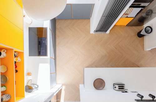 The kitchen is a true highlight of the space, designed to be both beautiful and functional. Bathed in natural light from the windows, this fully equipped space features quirky yellow and grey cabinetry, sleek countertops, and soothing white walls that all come together to create a contemporary space. There are also state-of-the-art appliances including a full-size refrigerator, oven, stovetop, washing machine, dryer, and dishwasher - what more could you need? From pots and pans to utensils, cutting boards, and serving dishes, everything has been thought of. Whether you’re whipping up a quick snack or hosting a dinner, the kitchen is a joy to use.
