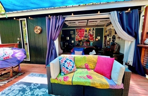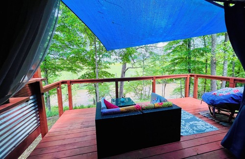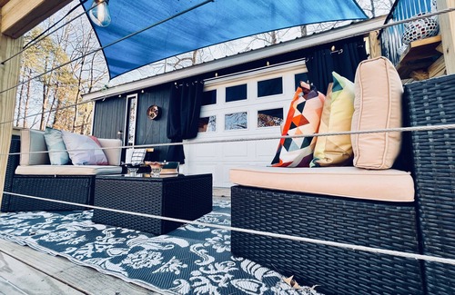 Vibrant Cabin is an open concept tiny home filled with accents like shiplap walls, metal ceilings, custom tile and artwork. We have a fun wood and metal bathroom, wood plank flooring and even a garage door opener! You’ll find a queen bed with luxurious pillows and bedding. Relax and soak in our freestanding tub surrounded by eclectic art and fun lighting options. Speaking of which… you can dim your overhead lights and change the room color at an point, thus changing the mood of the space instantly! You’ll have a record player, classic LP’s (70's and 80's for days), a Bose Soundlink Speaker and a medium size wine fridge (big enough for to-go boxes 😉) This inviting space has a garage door that opens to a beautiful deck overlooking the Calf Killer River…here you’ll find your living room space! You’ll be surrounded by warm lighting in and around the trees. You’ll find hammocks, swings, roses and wildflowers in the spring and summer.. A fire pit with cooktop for grilling, and the absolute best space in the area for some night sky viewing. You can easily walk into Sparta for dinner, drinks or a day of shopping! Two guests only please. It’s a space devoted to absolute relaxation. Reminder that we do not have Wi-Fi at this property but cell service is good so plan accordingly.