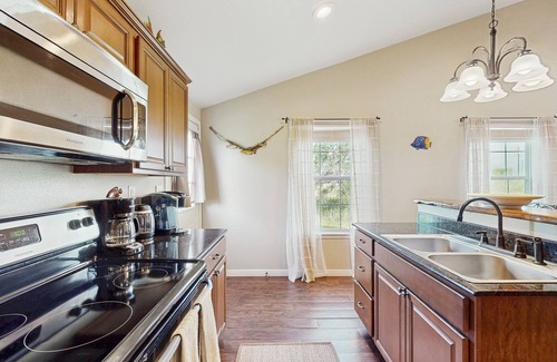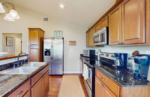 After an eventful day outside, wind down at your aquatic-themed holiday home. Put your feet up and take it easy in the living room while watching your favorite shows on the TV. When everyone is hungry, use the full kitchen with bar seating to entertain and prepare your favorite meals. Relax on the patio and add charred favorites to the menu using the gas grill, all the while basking in the warm Texas weather. You’ll have access to a private washer/dryer should you need to refresh for the next day’s adventures, as well as central air-conditioning and WiFi for added convenience.