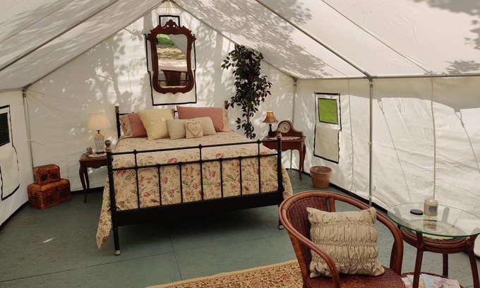 Peace of Paradise is what you'll find in 1 of our 5 quaint and cozy Glamping tents along the river, overlooking the spectacular river views! It's surreal beauty from every angle, tranquil peace and calm! A short walk takes you to the rivers edge where Bass and Pike are a delight to every fisherman! Your experience includes, but is not limited to, an open fire pit for cooking, table and chairs for eating, drinking water, dishwater, river and mountain views from your site, lamps, phone charger port, shared shower house and clean porta potties. Kayaking, paddle boarding, swimming and relaxing are a few of the charming delights just out your front door. Can't pull yourself away from the glacier blue river views, the charming old fruit trees in the lawn and the cozy campfire at night! Experiencing the western trains rumbling down the valley is a highlight to many campers. (There are no Railroad crossings or air horns near our property.) Just a short 2 miles down the road, a mineral soak awaits you at Quinn's Hot Springs Resort. You can also enjoy a cute, best in the west ice cream shop ten minutes away in the town of Wild Horse Plains, a darling old town which also hosts antique shops, grocery, hardware, hospital and so much more! The old and fascinating town of Thompson Falls and a local Bison range, are less than an hrs drive away!