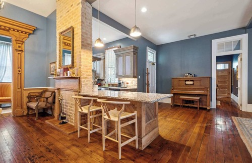 Originally built in 1900, this home features preserved cypress wood from the original bones of the house, exposed brick fireplaces and restored pine wood floors throughout. You can feel the grandeur with 12-foot ceilings, golden accents, artist’s murals, and Victorian décor. The space is furnished with local New Orleans antiques curated for the right amount of Southern charm and comfort.