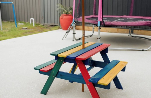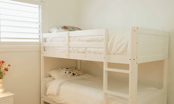 Each of the three bedrooms is thoughtfully designed to accommodate families with ceiling fans in each: the master bedroom features a comfortable king-size bed with full ensuite and walk in robe, while the second bedroom has another king bed and built in robe. The versatile third bedroom features 2 x bunk beds (4 singles), perfect for the kids or additional guests and more storage, with kids books and toys.