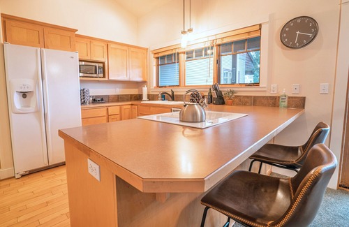 The “Peak-a-View” Retreat, located in desirable Pine Meadow Village, is a well-appointed condo offering vaulted ceilings, open kitchen/dining/living area, and single story convenience in a sparkling clean and stylish space. It accommodates 4 comfortably, 6 if you don’t mind being cozy! There is a large main bedroom and bath ensuite with walk-in closet; the 2nd bedroom has access to the second full bathroom just across the hall. The living room sofa folds out into a comfortable double bed for extra guests while both a toddler sized bed and a Pak n Play is are available for children. Both bathrooms provide soaps, shampoo and conditioner, hair dryers, extra razors… while the kitchen is fully equipped with all the cookware and appliances you could need and is well stocked providing a variety of spices, foil and baggies, etc . A/C to stay cool in the summer, and central heating plus a gas fireplace for winter nights. The west-facing patio and living room let you soak up unparalleled Central Oregon scenery with views of 5 mountains and a lovely water feature, while the deck provides multiple seating areas. The PMV amenities include a clubhouse, seasonal swimming pool, hot tub, tennis courts and paved walking paths in a peaceful quiet neighborhood. Just minutes away to the famous shops and restaurants of downtown -you literally can walk, or bike to town if you choose.