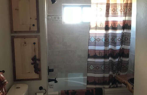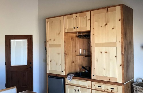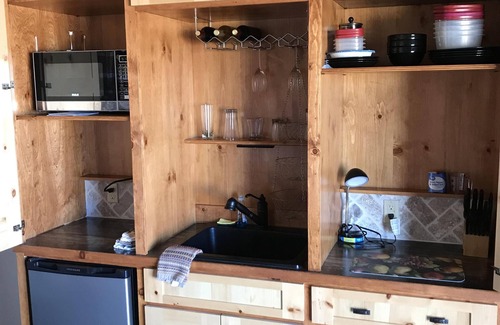 This small house has a comfortable queen bed and a fireplace.There is a full bath with a shower/tub combo and a vanity crafted from native alligator juniper. In addition, there is a small refrigerator, a small kitchen with microwave, and a hot plate. A gas grill is available on the porch allowing for inside or outside dinning.
