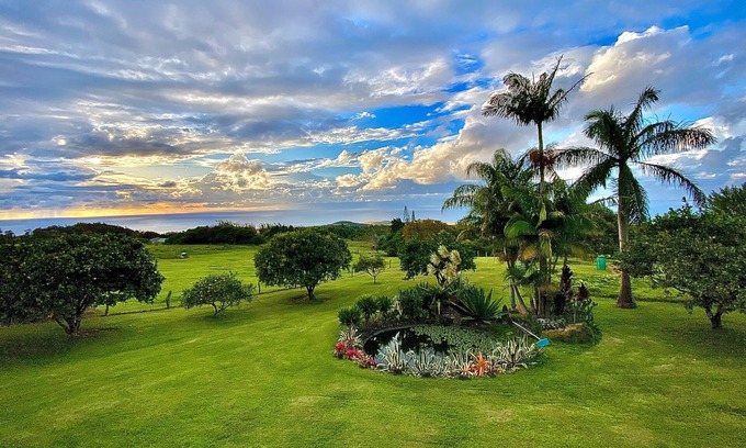 🌺 Enjoy the spirit of Aloha in this private setting with a fruit orchard and gorgeous ornamental and edible gardens accompanied by a magnificent view of the ocean and the nearby island of Maui.