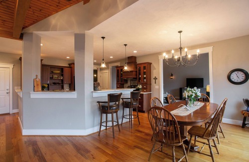 House layout: The main level- enter the house into a spacious great room with vaulted ceilings and a large 48-inch Smart TV for streaming only (Netflix, Hulu, and Amazon via Roku), room with a table and 4 chairs that are perfect for playing cards or games; half bath; the primary bedroom has a king bed, an amazing view and a private full bath (which features a jetted tub with separate shower and double sinks); fully stocked gourmet kitchen and island that seats 3; dining area and table that seats 8 (additional chairs available in next room); second living room/den that is featured off the kitchen with gas logs. Upstairs- A bedroom with a queen bed and full bath (shower only). Another bedroom with a queen bed. There is a full bath (Jack-n-Jill style) that you can access from the hallway or this bedroom with the queen bed. There is a room with 2 twin beds and another room with a double bed and coffee bar with sink. Outdoors- large deck with incredible views of the mountain and reservoir; fire table and gas grill; easily accessible parking for 4 cars and access to the garage if needed.