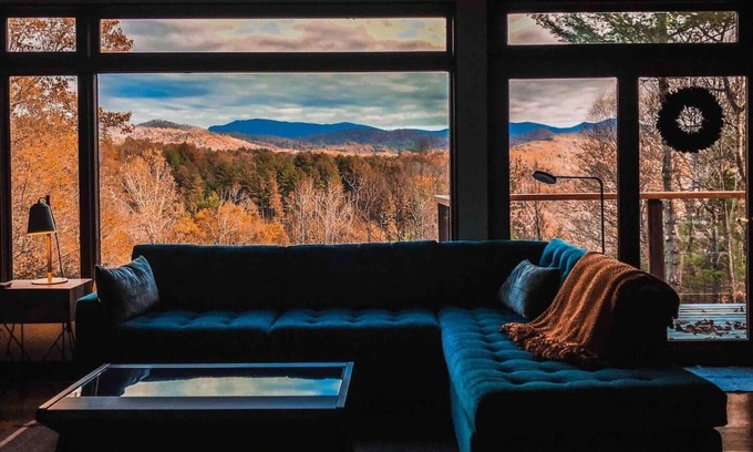 Perched on a hill above the N. Toe River at the end of the road you’ll find Dougs Way, a modern cabin with huge picture windows that frame long range mountain views as if it were art. Surrounded by old oaks and loblolly pines, the property is quiet and never cookie cutter. You’ll love the Japanese soaking tub, two-sided fireplace, gourmet kitchen, robust coffee/tea setup, and the true craftsmanship found in the artwork and handmade details like the bent cherrywood “cloud” above the dining table!