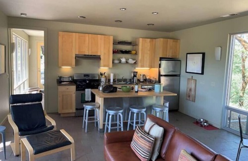 The Cottage features a modern and spacious floor plan planned around maximizing the indoor/outdoor lifestyle that Northern California is known for. Decorated with handsome fabrics, contemporary furniture, modern lighting and local artwork, DogWood creates a feel of Mendocino elegance for our guests. Urban comforts for both humans and their pets, include central heat and air-conditioning, a fully equipped kitchen, ceramic tile flooring throughout and a laundry room. For multiple guests, traveling together doesn’t mean you have to be on top of each other as the two bedrooms are separated by a large open living space.