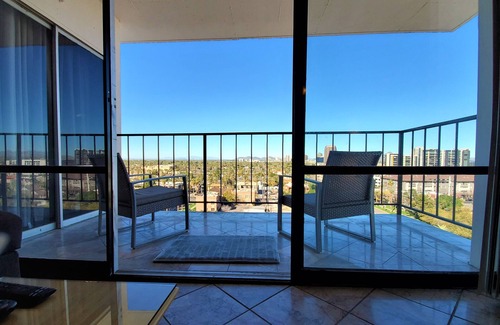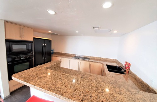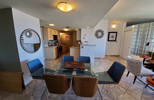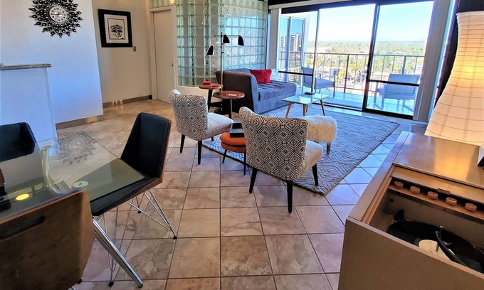 Take the elevator up to your 10th floor spacious and stylish mid century modern 1 bedroom condo with a full, updated kitchen and bath and marble tile floors. You will be safe here as there is staff on duty and private coded entry to the building. Equipped with Wi-Fi a 58” big screen Smart TV with cable and access to your own favorites like Netflix & Hulu. Bedroom features a comfy King bed. Access to gym, conference room, laundry room, and elevated outdoor pool at the third floor. Friendly door person in lobby from 8am to 8pm every day