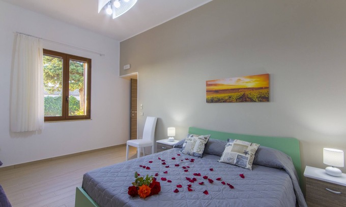 The house is located in a quiet area of Birgi, surrounded by the lush vineyards of the property. It is independent and equipped with all comforts: two large double bedrooms with private bathroom, living area with sitting area, dining area, kitchen equipped with fridge, oven etc. adjacent to the living area a large covered structure in which there is a wood-burning oven and a rustic terracotta kitchen excellent for barbecues The house has a large enclosed car park with the possibility of hosting your pets. We are a family of the Marsala countryside who has decided to make their home in Birgi available, located in one of the most beautiful corners of Sicily, in the western part of the province of Trapani where history, traditions and natural beauty have always given their best . Vigne al Vento is a structure overlooking the Egadi islands and Mount Erice, it is very close to renowned beaches and the Stagnone lagoon with its islands colonized since the 8th century BC. c. by the Phoenicians and with its pink salt pans. At sunset you can enjoy picturesque and unforgettable sunsets, also you will have the possibility of excursions to the archipelago of the Egadi islands. The lagoon is an ideal location for kitesurfing thanks to the winds that always blow. You can visit important centers such as Marsala, Trapani, Erice, Segesta which are about half an hour away by car. The property is only 5 minutes from Trapani-Birgi airport.