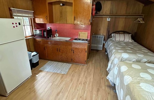 Cabin #5 sleeps two and offers a cozy floorplan and large deck.