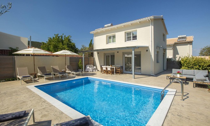 Vilana villa is 1 out of 3 private villas of Grappolo Lefkada Villas. It's located just 2 km from Lefkada city center in a quiet and green area named Apolpaina. You will have access to a private villa with all necessary amenities for a comfortable stay. Able to accommodate up to 6 people, it's a perfect choice either for a family or a small group of friends. It's a cozy place that will instantly make you feel at home. Our exterior has everything you need from taking a swim in the swimming pool in the morning to having a BBQ with your company.