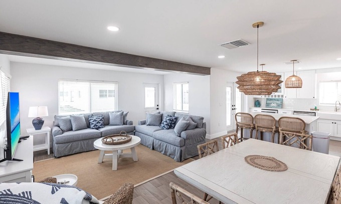 Welcome to Villa #27, your home away from home on beautiful Crescent Beach, Siesta Key. As one of Aloha Kai’s closest villas to the Gulf of Mexico, you are just steps away from the top-rated beach in the United States. The villa’s décor is comfy and casual, featuring two sofas, a dining table that seats six, and an open kitchen—perfect for relaxing evenings in. Kick back and enjoy a late-night movie with all your favorite channels and streaming apps available on the TV. Villa #27 offers two bedrooms, two bathrooms, and a spacious family room larger than most at Aloha Kai. The fully equipped kitchen and washer/dryer add to the convenience. One bedroom has a king-size bed, while the second features a queen bed with a twin trundle and a pull-out sofa, comfortably accommodating up to five guests. Outside, you’ll find a private outdoor shower, a charcoal grill, and a small front patio with two Adirondack chairs—ideal for savoring an evening cocktail. The villa includes one parking space, with room for a second car in the driveway if needed. We hope you enjoy your unforgettable vacation on Siesta Key!