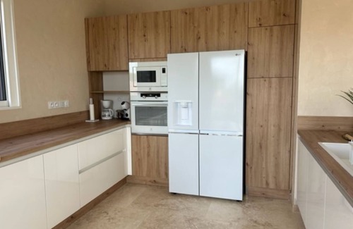 The entrance hall with utility and cloak rooms and wc with wash handbasin leads to the extremely spacious living area of 70m2. The US style kitchen is fully equipped with all that you could require - American fridge freezer, induction hob,oven, microwave, 2 coffee machines (espresso and filter), toaster. A breakfast bar separates the kitchen from the comfortable, well furnished living/dining room - a large table for up to 8 and large sofa.