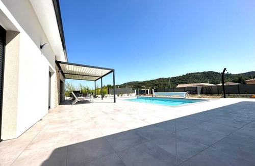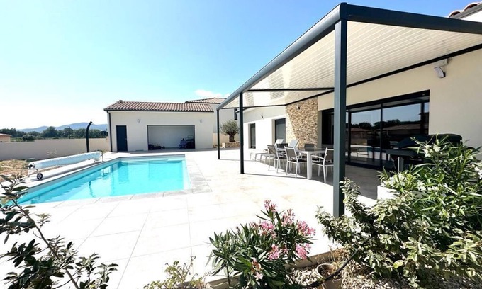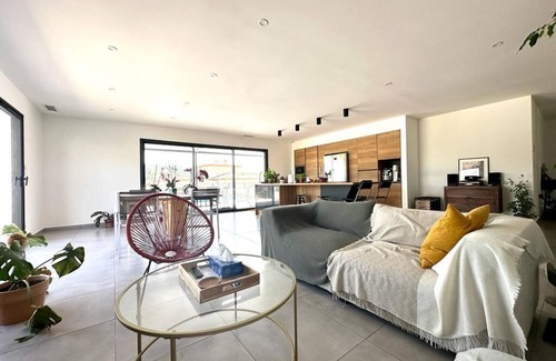 Tiled terrace 150m² with bioclimatic pergola, barbecue. Private swimming pool secured by alarm, flat bottom depth 1.40m, garden furniture, deckchairs. Pretty enclosed garden of 1300m² soon to be finished with trees and landscaping, pétanque court... Indoor parking, capacity for 4 or 5 vehicles. TV, Wifi available.