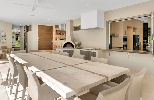 Crafted with a flawless blend of privacy and spaciousness, the villa comfortably accommodates up to 14 guests. The primary suite boasts a luxurious king bed, with triple shower ensuite, office space and spa room, while two additional poolside bedrooms (king and queen) provide instant access to outdoor tranquility both with own ensuites. Downstairs, a flexible layout includes two more bedrooms, with bathrooms (king and two king singles), a stylish entry-level double bedroom, and a unique Murphy bedroom, catering seamlessly to multi-generational families and corporate gatherings alike.
