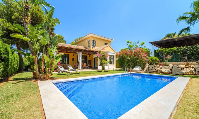 Wonderful and peaceful villa with private pool in Jávea, coastal and residential area. The villa has 3 bedrooms, 2 bathrooms and 1 guest toilet, distributed over 2 floors. The accommodation offers great privacy, a wonderful garden with lawn and trees, a private pool and mountain views. The comfort, proximity to the beach and leisure sites, make this luxury villa an ideal accommodation to spend your holidays with family or friends.AccommodationLocated on two floors, Villa Abaesko offers a charming open-plan living room and dining room where groups and families have enough space to gather and enjoy time together. Meals can be served in this area, and the elegant dining table makes it an excellent place for more formal meals. The spacious living room behind the dining room offers sofas to relax, with movies on the wall-mounted cable TV! A guest bathroom is located on this floor, which also houses the kitchen. Fully equipped, it offers an electric oven, microwave, dishwasher, refrigerator, coffee maker, kettle and toaster, and a comfortable table and chairs located next to a window with beautiful views of the outside.The first of the three bedrooms is located on the ground floor and offers direct access to the kitchen and outdoor areas. A double bed and an en-suite bathroom ensure that you can find your refuge in this villa. Upstairs, guests are offered two other beautiful rooms, one with three single beds and another with a double bed. Both rooms have ceiling fans to cool down in the warm climate, and both share a beautiful bathroom!The vibrant green of the outdoor lawn together with the bright blue of the outdoor pool sits wonderfully with the vivid colours of the plants around the villa to give your eyes a feast of colours. Dine outdoors at the dining table under a straw roof while the mountain slope views provide a beautiful backdrop for meals. Take a dip in the outdoor pool for hours, next to the quiet lawn or walk barefoot on its grass while heading to the sun loungers to relaxAdvantages:- Free Wi-Fi- Air conditioning in all rooms- Satellite television- Washing machine and iron available.- Ceiling fans in the rooms.- Free covered parking for 2 cars.- Private swimming pool (8m x 4m)- Covered terrace and barbecue- Garden with lawn, trees and garden furniture with sun loungers.- Fenced plotSituation:The closest town is Benitatxell less than 3 kilometres from the townThe closest beach: El Arenal (less than 5 kilometres from the town)The closest airport: Alicante (less than 100 kilometres from the town)EnvironmentOn the beautiful Mediterranean coast, the city of Jávea is a pleasant place that delights visitors of the Costa Blanca with its lively marina and beautiful beaches. There are also multiple sports activities to participate in, such as sailing, diving and snorkelling, golf tennis, even hiking up to Montgó. The sea is of great importance in Jávea, and its excellent restaurants make the most of it by serving fish dishes prepared by experts with the best of the day's catch. This is how Jávea combines the uniqueness and charm of a small Mediterranean town with the convenience of having all services nearby, from supermarkets and pharmacies to restaurants, bars and terracesAdditional notes:Supplies are included in the rental price as long as responsible consumption is madeA cot and a high chair are available upon request (additional cost)Pets welcome upon request with additional costHouse rulesNo parties or events are allowedSmoking is not permittedGroups of young people under 25 are not accepted