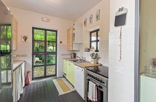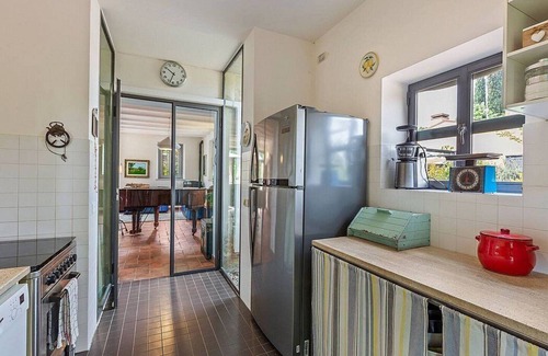 You will be able to enter the kitchen from the first living room. It is equipped with a five-burner gas cooker, an electric oven, a large refrigerator with freezer, a dishwasher, an Italian-style coffee-maker and a kettle. From the kitchen a French door will take you to the garden. The room has two small windows, as well as two glass walls.