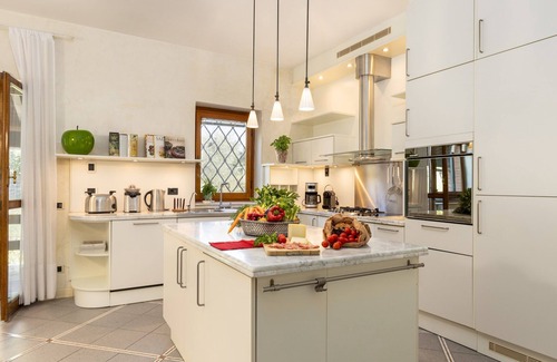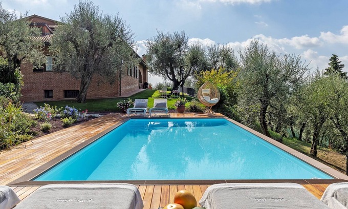 The villa is surrounded by about 3000 square meters of well-kept and fenced garden, planted with olive trees, cypresses, fruit trees and flowering shrubs. The main entrance leads, through a gate, to a gravel driveway and a shaded parking area. A panoramic porch outside the dining area is furnished for outdoor dining and moments of relaxation. Nearby there is a barbecue and a fire pit with seating. In the garden there are several seating areas and an aromatic vegetable garden available for guests. A grassy path leads to the pool area and a lounge terrace with views of the surrounding hills. N.B.: Please note that the photo shoots are usually carried out in spring, so the colors and blooms of the gardens, lawns and parks may be different when you enter the villa.